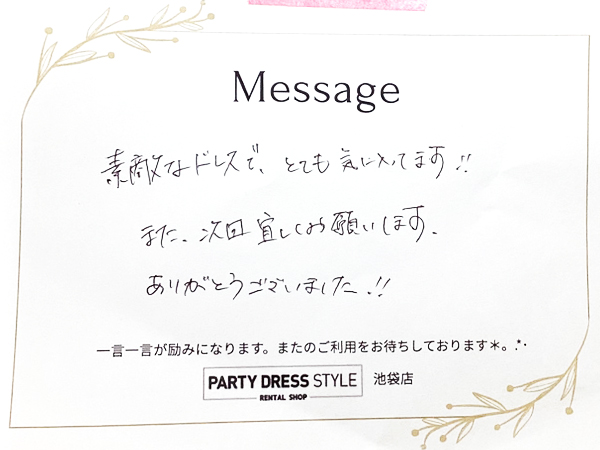 「急遽ドレスが必要に(汗)」「買いに行く時間がない..」そんな方も安心♩来店当日の持ち帰りシステムだから、その日の利用も可能!お店からそのまま着用して行くのもOK!