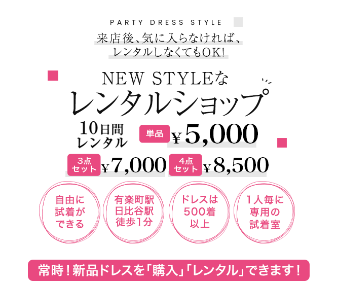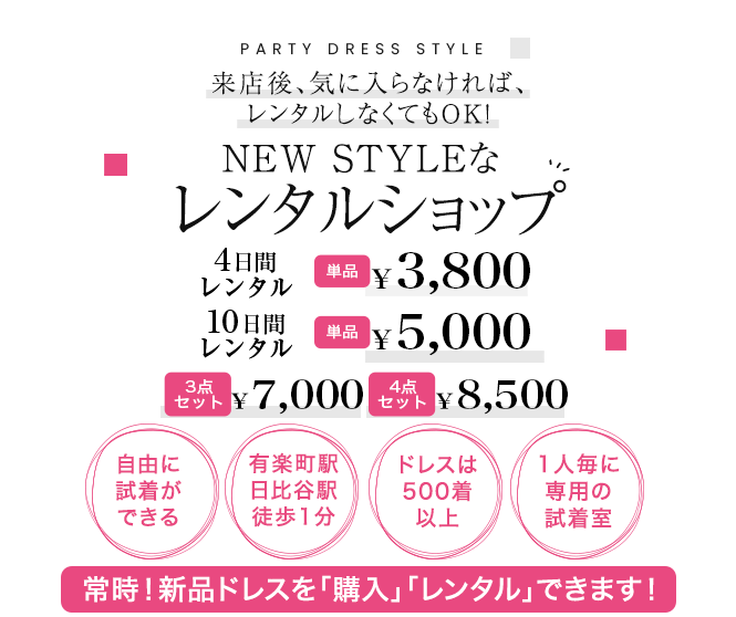 新品新作ドレスを「購入」も「レンタル」も出来る東京有楽町にあるNEW STYLEなドレスショップです。
