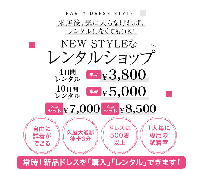 新品新作ドレスを「購入」も「レンタル」も出来る名古屋久屋大通にあるNEW STYLEなドレスショップです。
