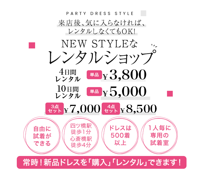 新品新作ドレスを「購入」も「レンタル」も出来る大阪心斎橋にあるNEW STYLEなドレスショップです。
