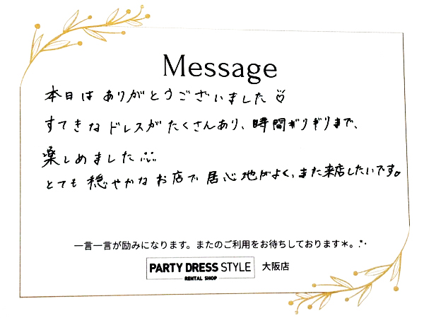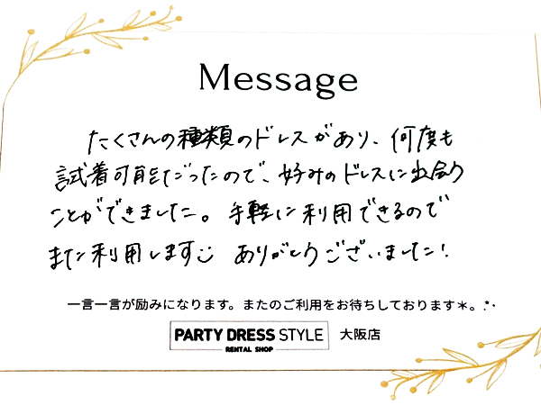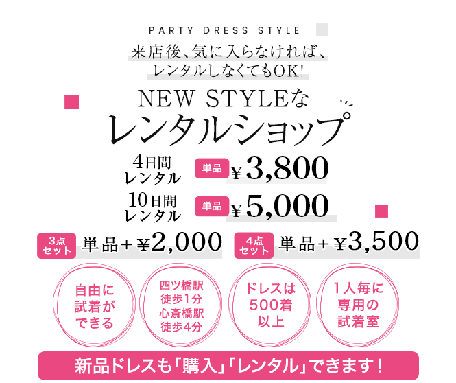 心斎橋駅から4分ですので「急遽ドレスが必要に(汗)」「買いに行く時間がない...」そんな方も安心♪当日予約OK!来店当日の持ち帰りシステムだから、その日の利用も可能!お店からそのまま着用していくのもOKです!