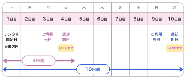 「レンタル開始日」から「ご返却日」までの4日間(3泊4日)or10日間(9泊10日)レンタルとなります。